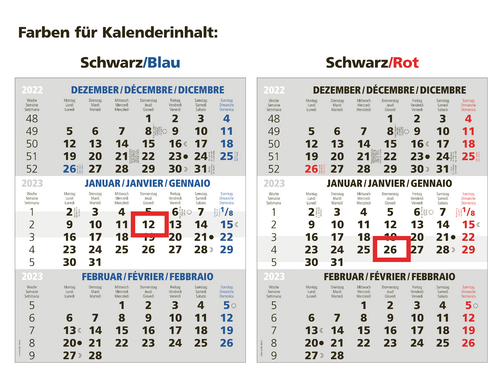 - 12 Blatt, mit Mondphasen und allgemeinen Feiertagen